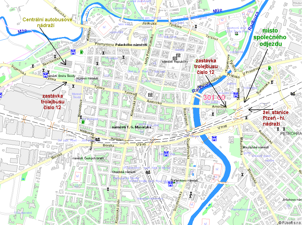 Účastníci, kteří přicestují do Plzně autobusem na Centrální autobusové nádraží (CAN), se mohou přesunout k Hlavnímu vlakovému nádraží takto. Projdeme hlavní budovou CAN, přejdeme silnici, park (parkoviště) a ještě jednu silnici k hlavní bráně podniku ŠKODA. Zde je trolejbusová zastávka linky č. 12 směr Božkov. Vystoupíme na čtvrté zastávce - zastávka Hlavní vlakové nádraží. Zde sejdeme do podchodu a vyjdeme východem ...